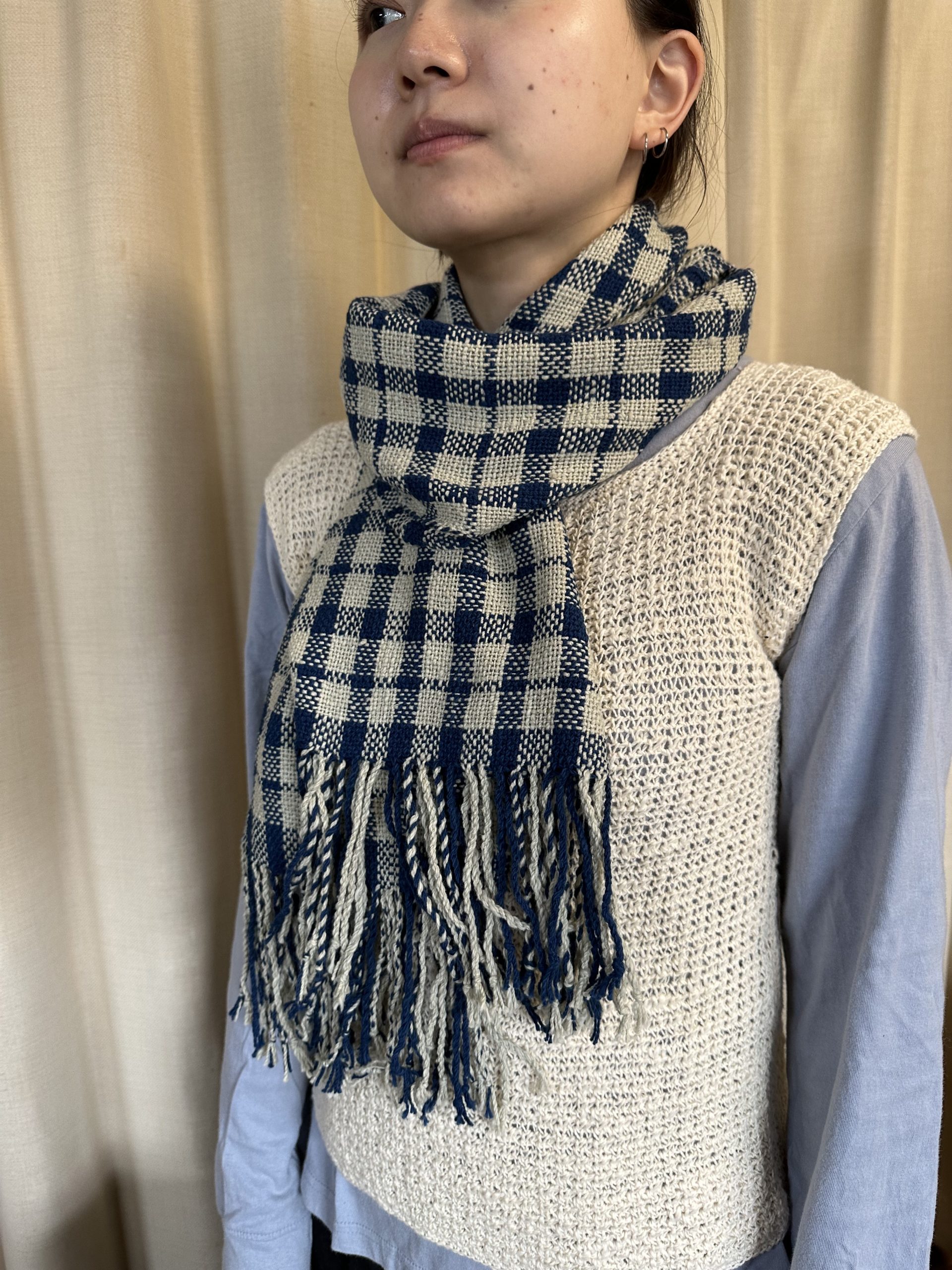 マフラー生成りと藍染を格子に手織りしたのオーガニックコットン100%ハンドメイド作品です。